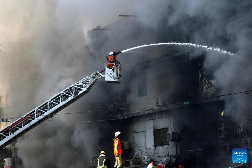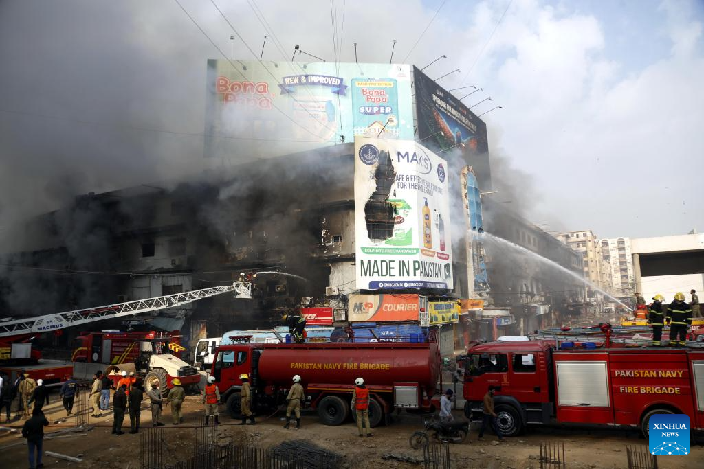 Firefighters try to extinguish a fire breaking out at a shopping mall in Karachi, Pakistan, on Jan. 18, 2026. The death toll from a fire at a shopping mall in Pakistan's southern port city of Karachi rose to 14 on Monday morning after rescue teams recovered more bodies during a search operation, officials said. (Xinhua)