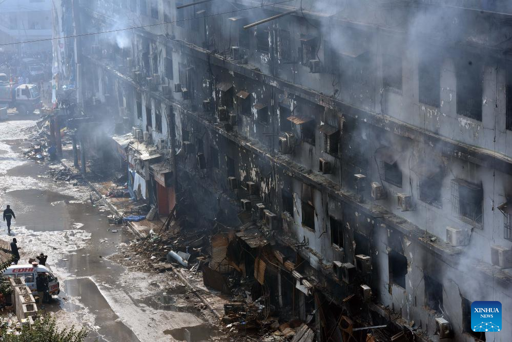This photo taken on Jan. 19, 2026 shows the fire site at a shopping mall in Karachi, Pakistan. The death toll from a fire at a shopping mall in Pakistan's southern port city of Karachi rose to 14 on Monday morning after rescue teams recovered more bodies during a search operation, officials said. (Str/Xinhua)