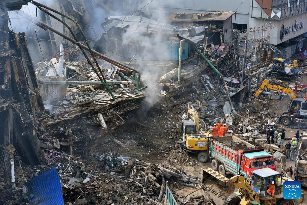 Rescuers work at the fire site at a shopping mall in Karachi, Pakistan, on Jan. 19, 2026. The death toll from a fire at a shopping mall in Pakistan's southern port city of Karachi rose to 14 on Monday morning after rescue teams recovered more bodies during a search operation, officials said. (Str/Xinhua)