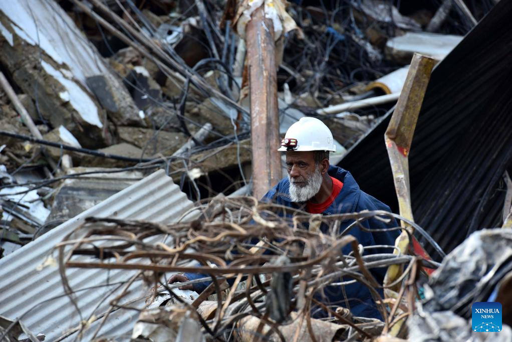 A rescuer works at the fire site at a shopping mall in Karachi, Pakistan, on Jan. 19, 2026. The death toll from a fire at a shopping mall in Pakistan's southern port city of Karachi rose to 14 on Monday morning after rescue teams recovered more bodies during a search operation, officials said. (Str/Xinhua)