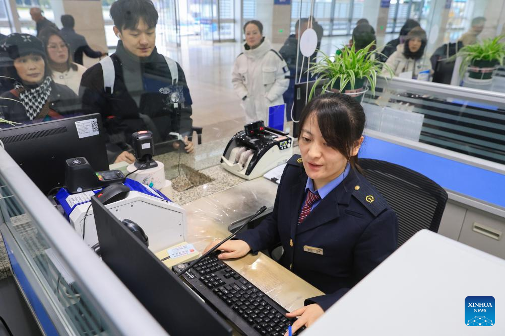 A staff member handles ticketing services for passengers at a railway station in Nanjing, east China's Jiangsu Province, Jan. 19, 2026. (Photo by Su Yang/Xinhua)