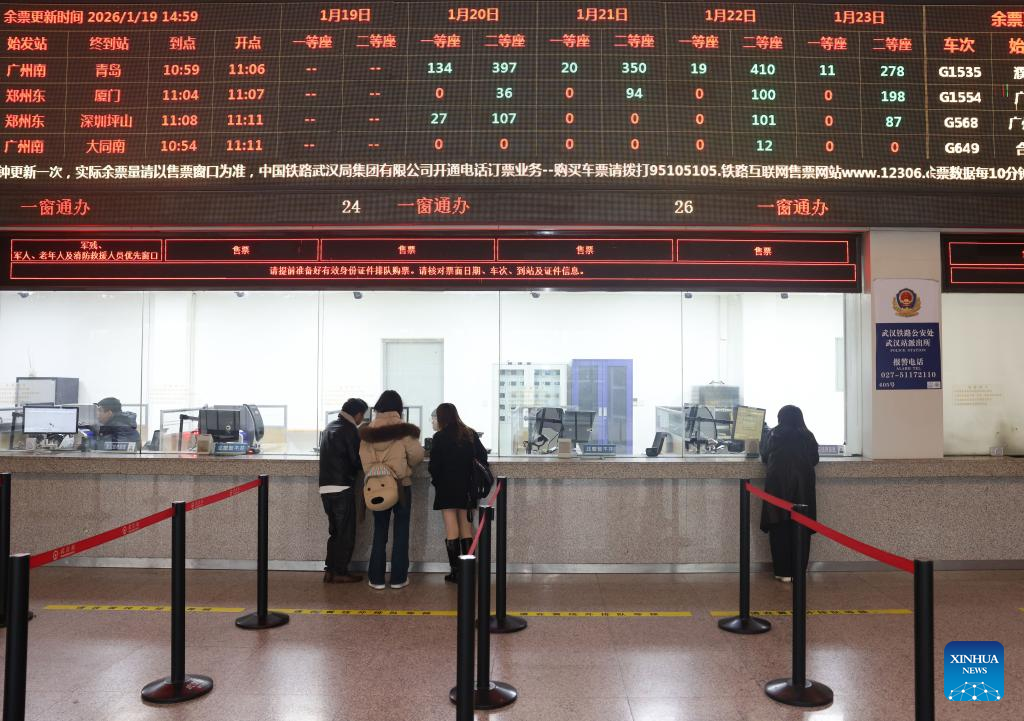Passengers purchase train tickets at a railway station in Wuhan, central China's Hubei Province, Jan. 19, 2026. (Photo by Zhao Jun/Xinhua)