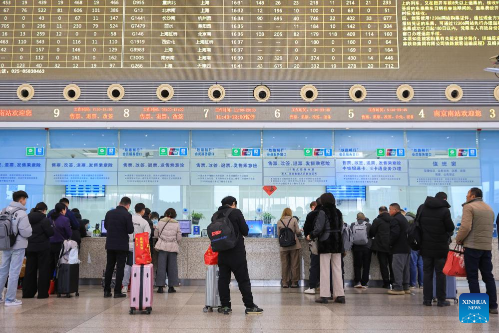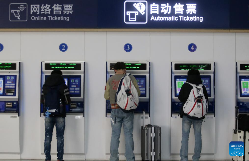 Passengers purchase train tickets at a railway station in Nanjing, east China's Jiangsu Province, Jan. 19, 2026. (Photo by Su Yang/Xinhua)