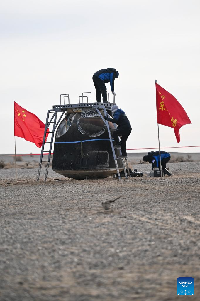 JIUQUAN, Jan. 19 (Xinhua) -- The return capsule of the Shenzhou-20 spaceship, carrying no astronauts, touched down at the Dongfeng landing site in north China's Inner Mongolia Autonomous Region at 9:34 a.m. (Beijing Time) on Monday, according to the China Manned Space Agency (CMSA).