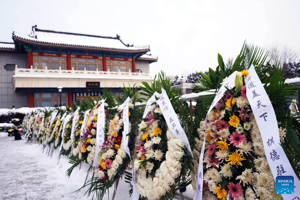 Floral wreaths are laid outside the venue of the farewell ceremony of late Chinese Go master Nie Weiping in Beijing, capital of China, Jan. 18, 2026. Chinese Go master Nie Weiping died at the age of 73 in Beijing on Wednesday night, the Chinese Weiqi (Go) Association announced on Thursday.