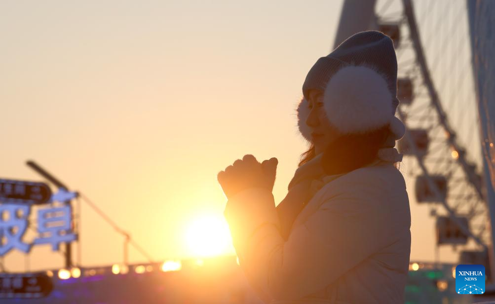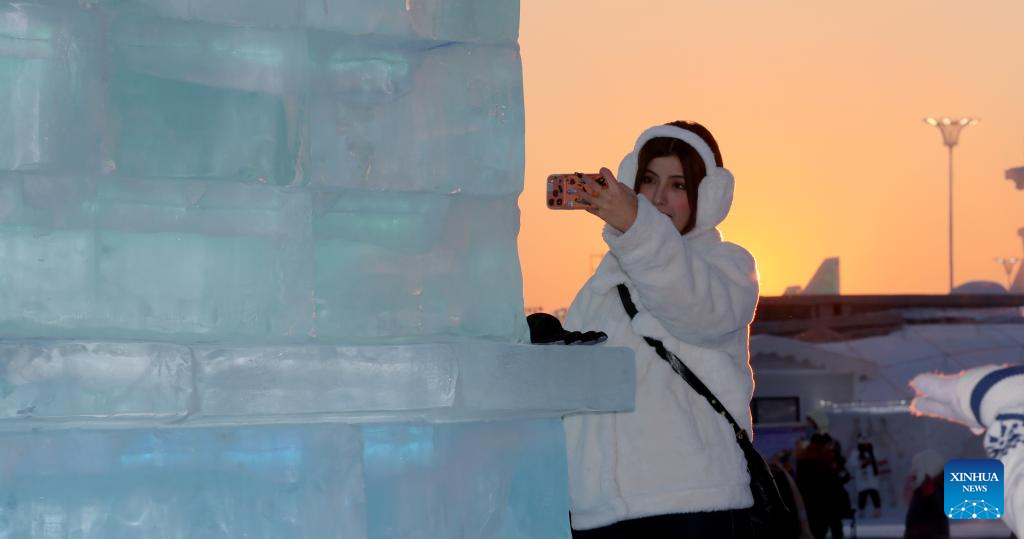 Tourists have fun at sunset at the Harbin Ice-Snow World, the world's largest ice-and-snow theme park, in Harbin, northeast China's Heilongjiang Province, Jan. 18, 2026. (Xinhua/Wang Jianwei)