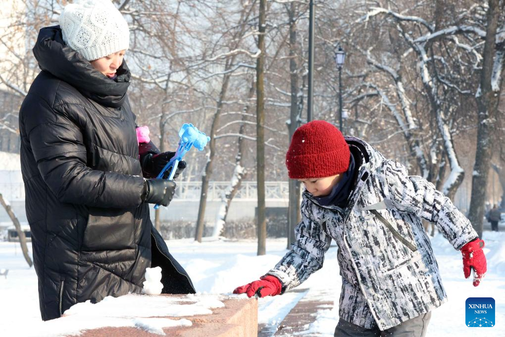 People have fun in a street after snow in Bishkek, Kyrgyzstan, Jan. 18, 2026. (Photo by Roman/Xinhua)