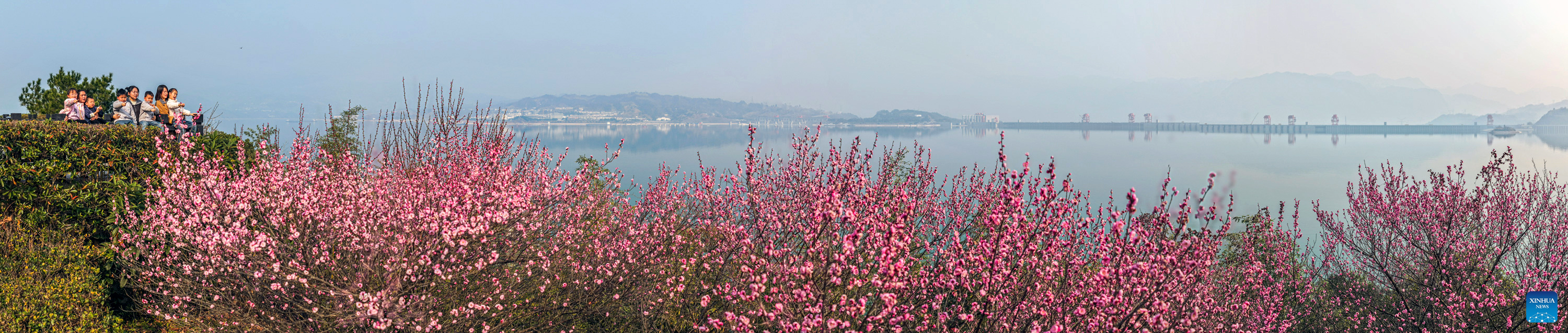 A drone panoramic photo taken on Jan. 17, 2026 shows people enjoying plum blossoms at the scenic area of the hometown of Qu Yuan, a patriotic poet of ancient China, in Zigui County of Yichang, central China's Hubei Province. (Photo by Wang Gang/Xinhua)
