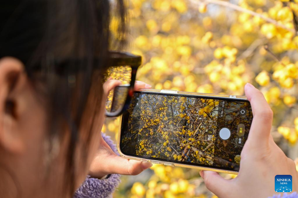 A woman takes photos of wintersweet blossoms in Huai'an, east China's Jiangsu Province, Jan. 13, 2026. (Photo by Liang Debin/Xinhua)
