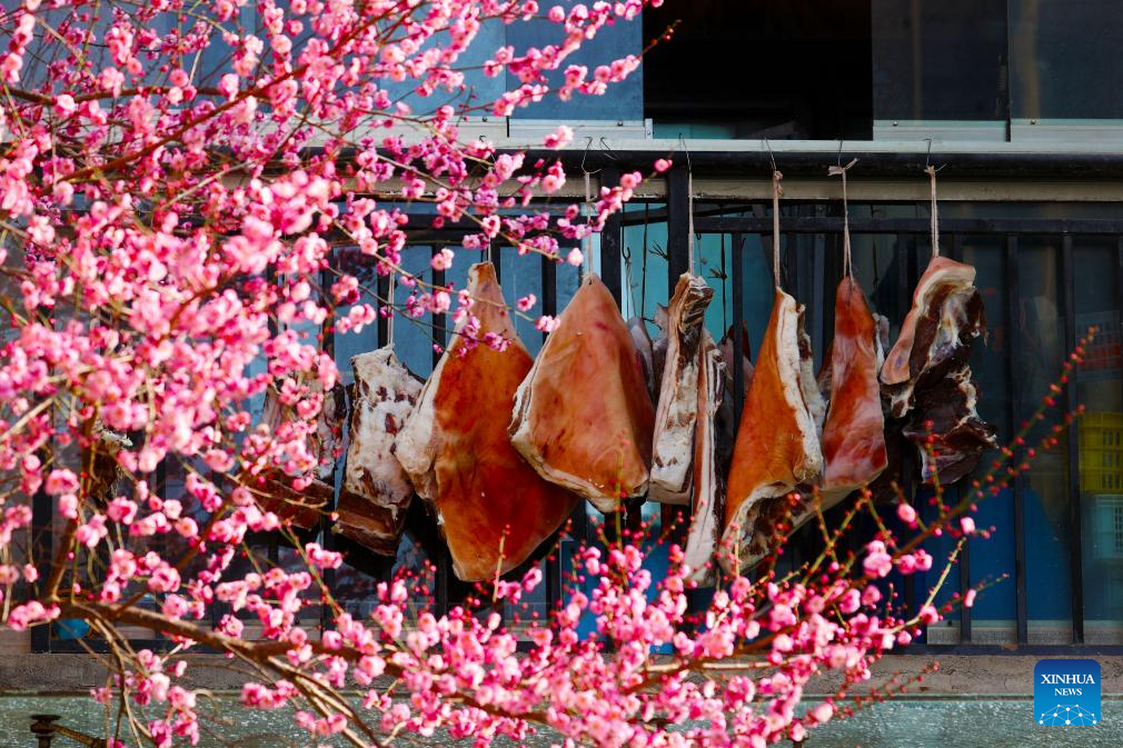 Plum blossoms are seen with a line of traditional preserved pork, known as La Rou, in Qianjiang District of Chongqing, southwest China, Jan. 13, 2026. (Photo by Yang Min/Xinhua)
