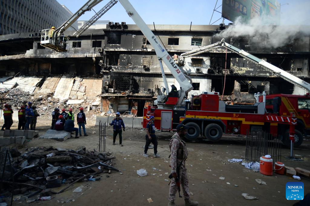 Rescuers work at the fire site of a shopping mall in Karachi, Pakistan, Jan. 19, 2026. The death toll from a massive fire at a multi-story commercial building in Pakistan's southern port city of Karachi has risen to 26, while 74 people are still missing, officials said on Tuesday. (Xinhua)