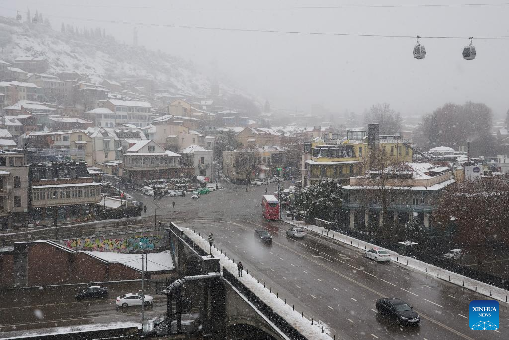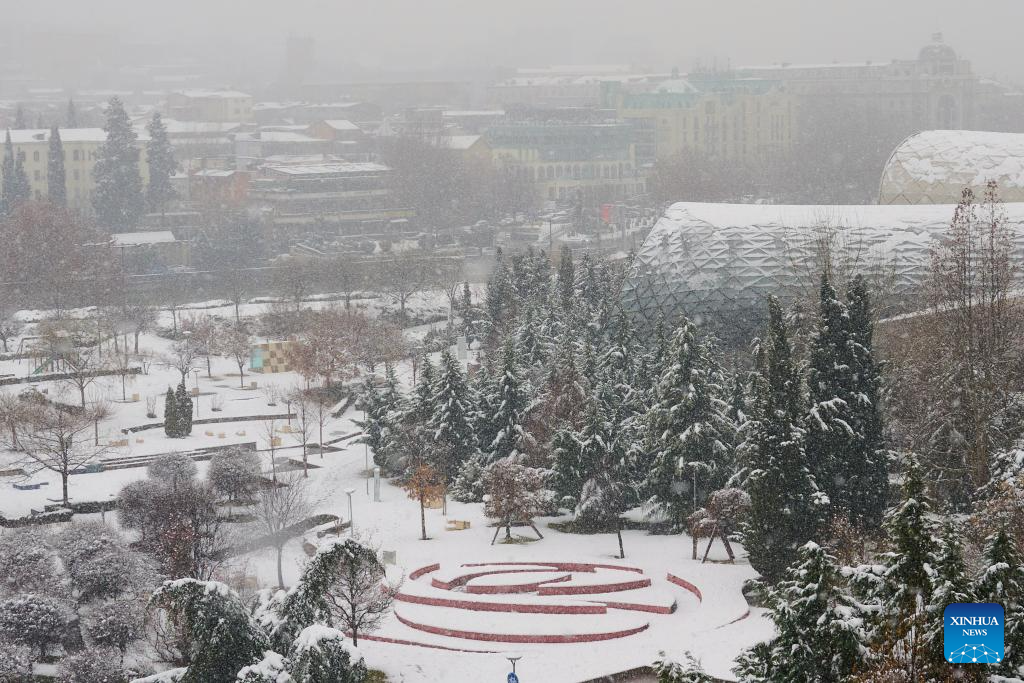 Photo taken on Jan. 19, 2026 shows snowy scenery in Rike Park in Tbilisi, capital of Georgia. (Photo by Alexander Imedashvili/Xinhua)