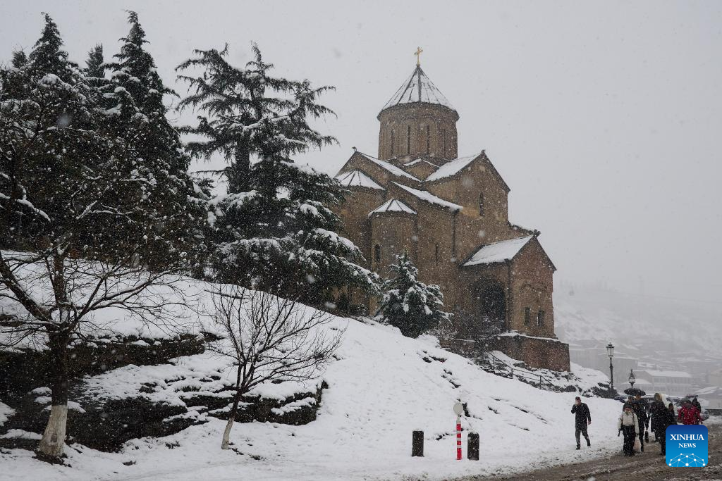 Photo taken on Jan. 19, 2026 shows snow-covered Metekhi Church in Tbilisi, capital of Georgia. (Photo by Alexander Imedashvili/Xinhua)