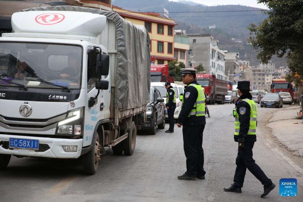 Police officers direct traffic in Laodian Town of Qiaojia County in southwest China's Yunnan Province, Jan. 20, 2026. (Photo by Yan Keren/Xinhua)