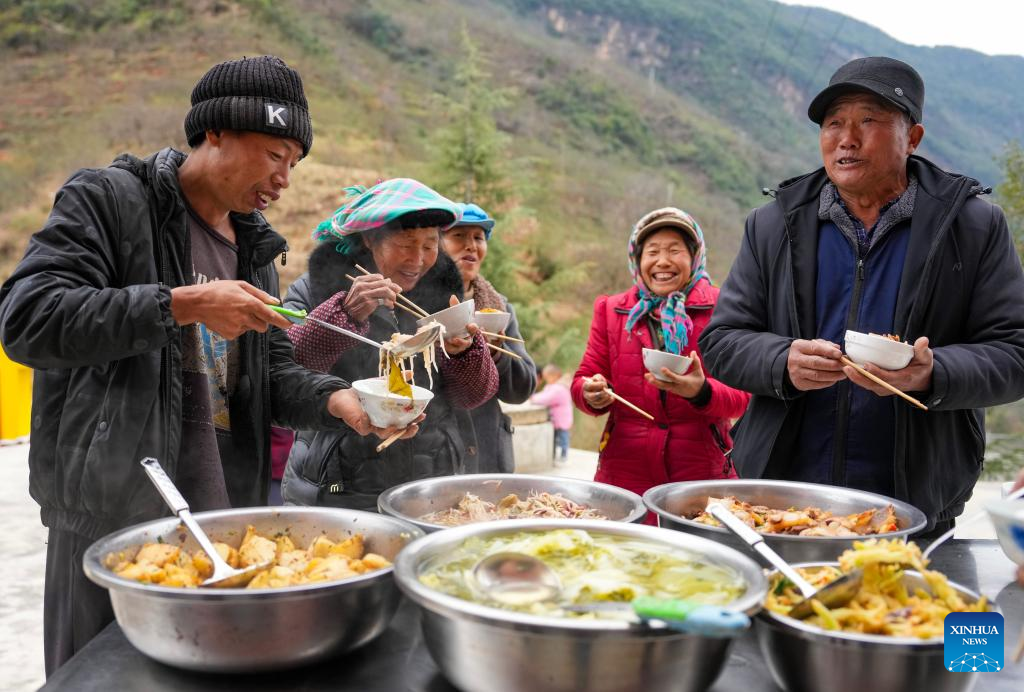 Villagers have lunch at a temporary relocation site in Hongshiyan Village of Qiaojia County, southwest China's Yunnan Province, Jan. 20, 2026. (Xinhua/Chen Xinbo)