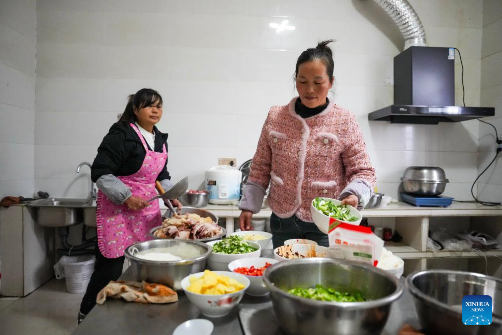 Villager Qian Zhenzhen (R) helps to cook at a temporary relocation site in Hongshiyan Village of Qiaojia County, southwest China's Yunnan Province, Jan. 20, 2026. (Xinhua/Chen Xinbo)