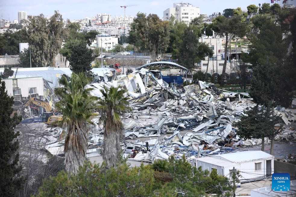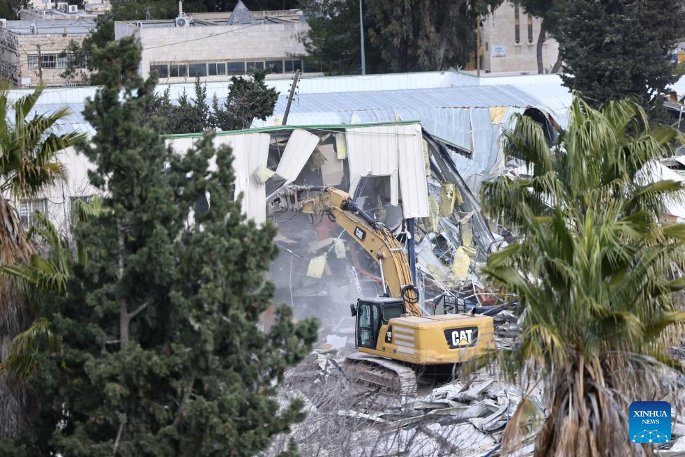 Israeli authorities demolish a building within the East Jerusalem compound of the United Nations Relief and Works Agency for Palestine Refugees (UNRWA), Jan. 20, 2026. Israeli authorities on Tuesday demolished several buildings within the East Jerusalem compound of the UNRWA, an action that drew immediate and sharp condemnation from the UN body.
