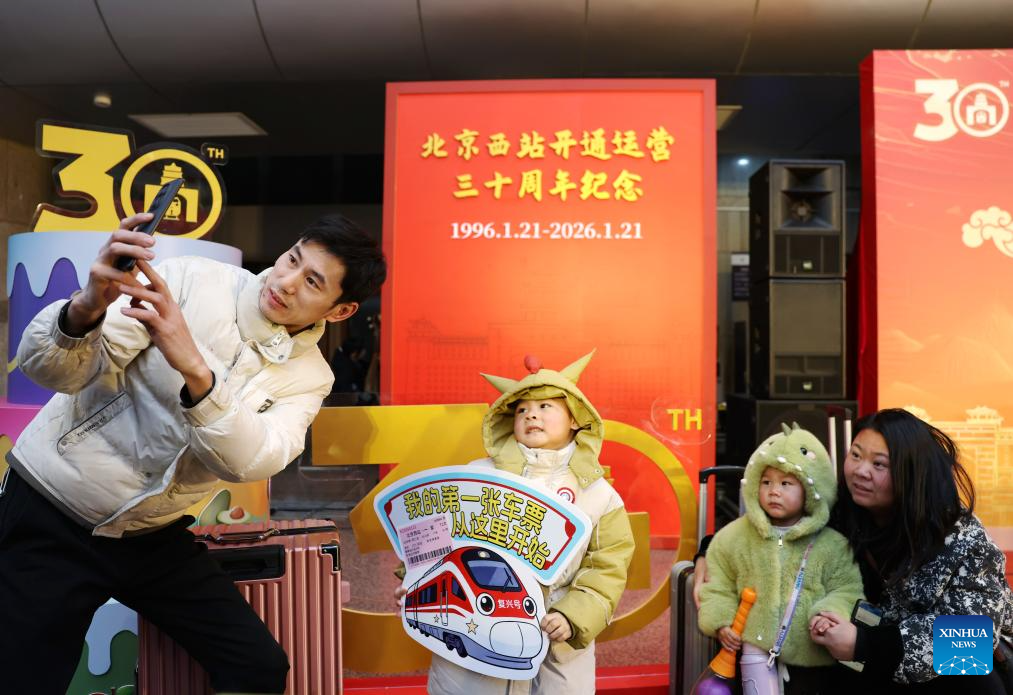 Passengers take photos at the Beijing West Railway Station in Beijing, capital of China, on Jan. 21, 2026. The Beijing West Railway Station marked its 30th anniversary on Wednesday. Over the past three decades, this modern transport hub has handled more than 1.96 billion passenger trips, standing as a witness to China's development and the evolution of its railway network. (Xinhua/Zhang Chenlin)