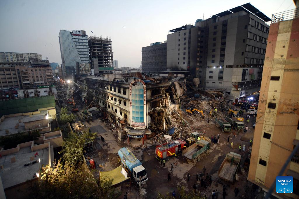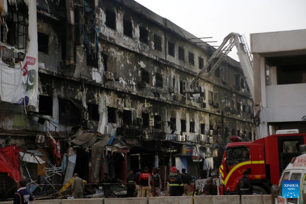Photo taken on Jan. 21, 2026 shows a burnt shopping mall in southern Pakistani port city of Karachi. The death toll from a shopping mall fire in Pakistan's southern port city of Karachi climbed to 60 after at least 30 bodies were recovered from a shop of the multi-storey building, officials said on Wednesday. (Str/Xinhua)