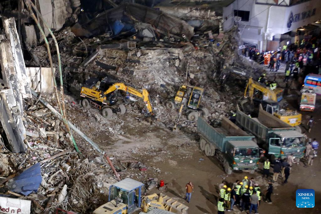 Rescuers use heavy machinery to remove debris at the fire site of a shopping mall in southern Pakistani port city of Karachi on Jan. 21, 2026. The death toll from the fire at a shopping mall in Pakistan's southern port city of Karachi surged to 60 after rescue workers recovered several bodies, police officials said on Wednesday. (Str/Xinhua)