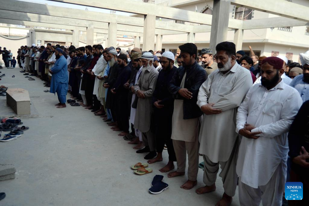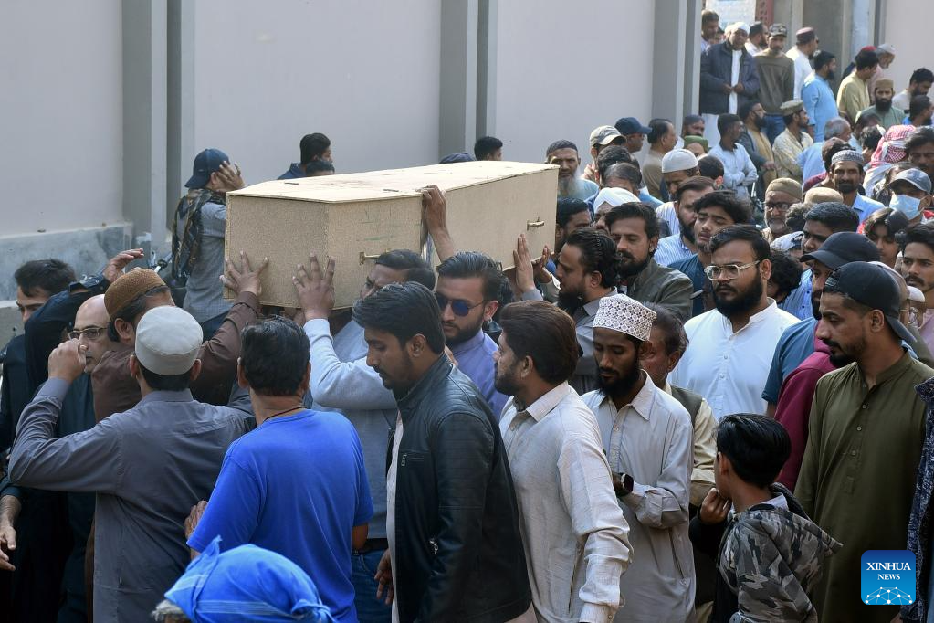 People attend the funeral of a shopping mall fire victim in southern Pakistani port city of Karachi on Jan. 21, 2026. The death toll from a shopping mall fire in Pakistan's southern port city of Karachi climbed to 60 after at least 30 bodies were recovered from a shop of the multi-storey building, officials said on Wednesday. (Str/Xinhua)