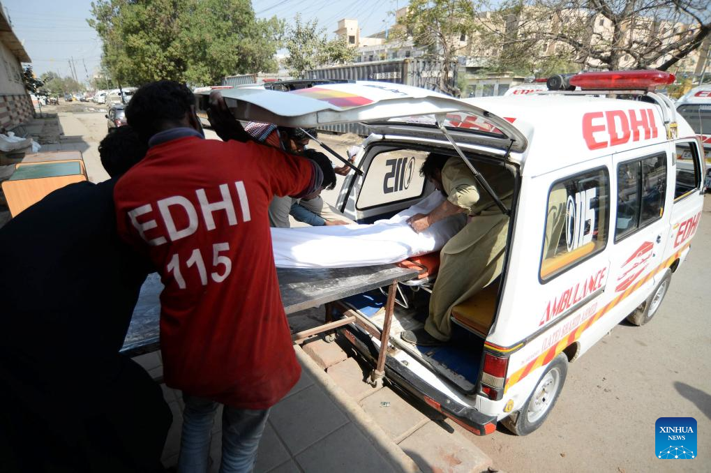 Rescuers transfer a body at a mortuary following a fire at a shopping mall in southern Pakistani port city of Karachi on Jan. 21, 2026. The death toll from a shopping mall fire in Pakistan's southern port city of Karachi climbed to 60 after at least 30 bodies were recovered from a shop of the multi-storey building, officials said on Wednesday. (Str/Xinhua)