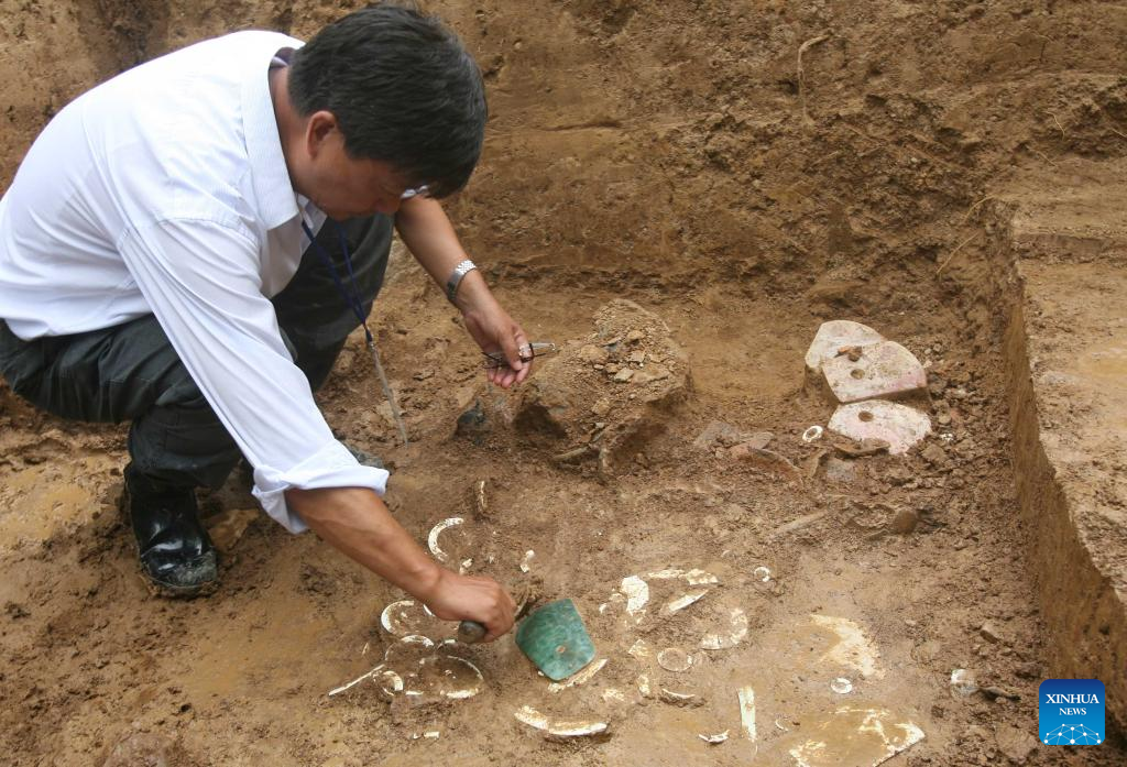 This file photo shows an archaeologist working at the Lingjiatan relics site in Hanshan County, Ma'anshan, east China's Anhui Province, June 28, 2007. The Lingjiatan relics site in east China's Anhui is a Neolithic settlement dating back 5,300 to 5,800 years, with an area of about 1.6 million square meters.
