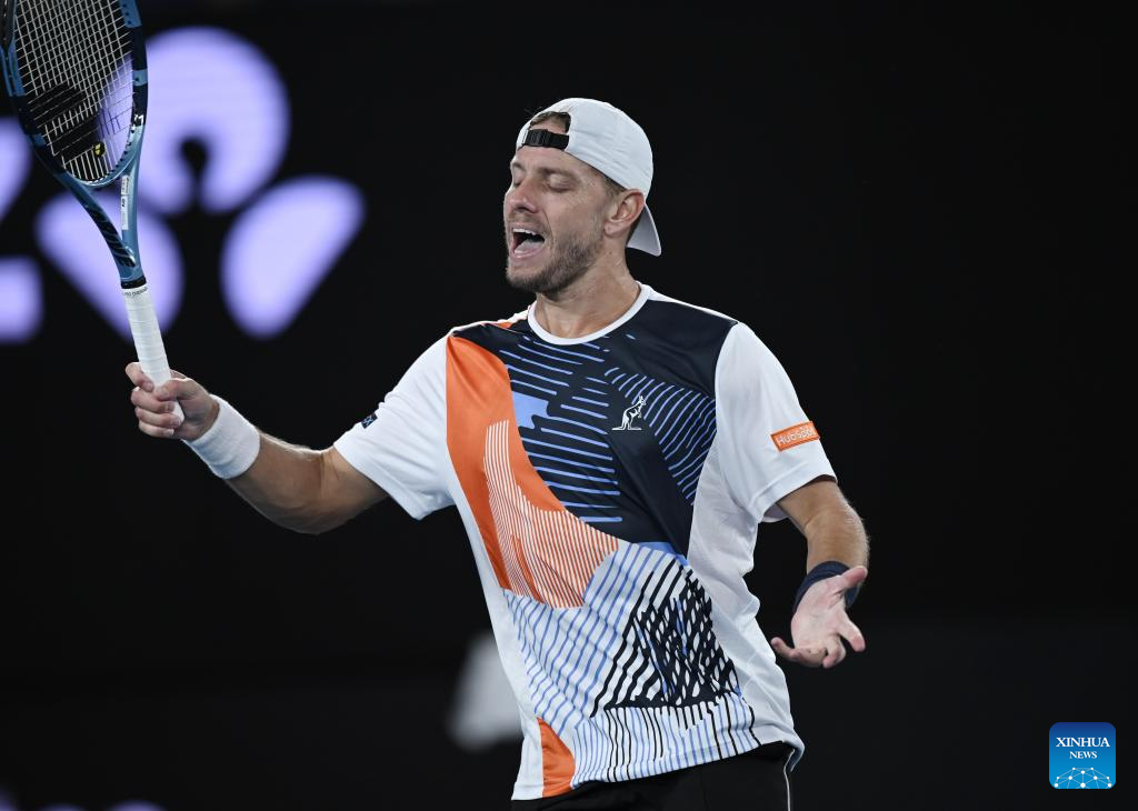 James Duckworth of Australia reacts during the men's singles 2nd round match between Jannik Sinner of Italy and James Duckworth of Australia at the Australian Open tennis tournament in Melbourne, Australia, Jan. 22, 2026. (Photo by Wang Shen/Xinhua)