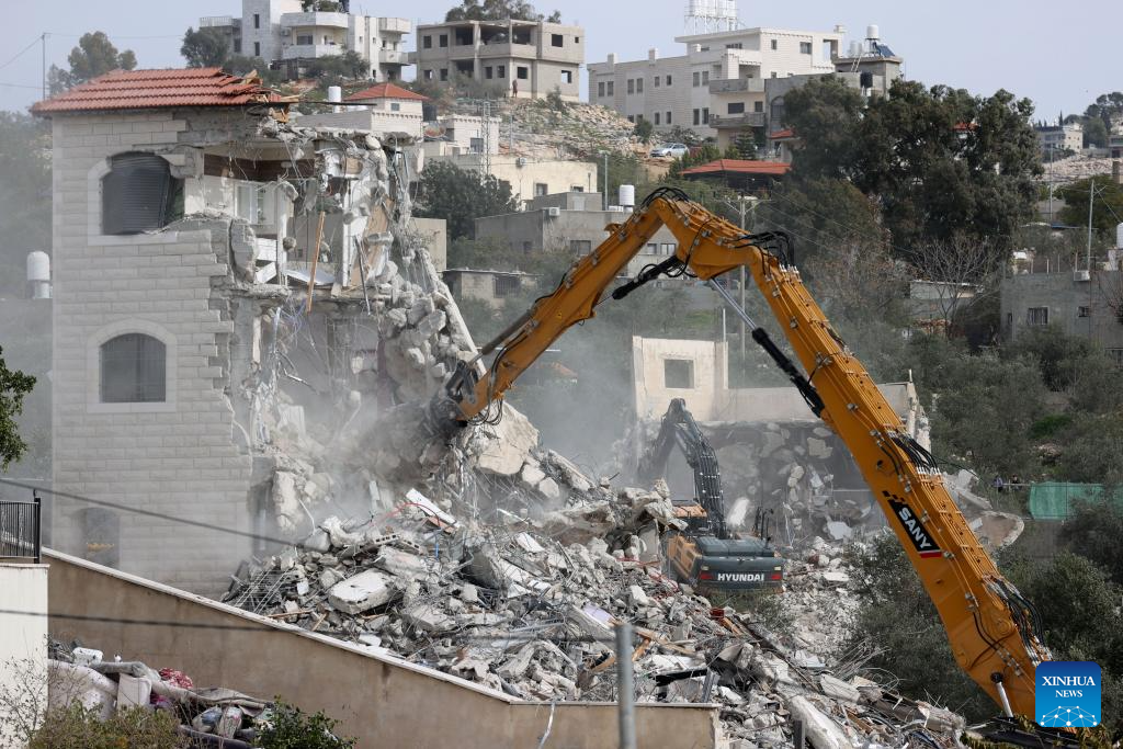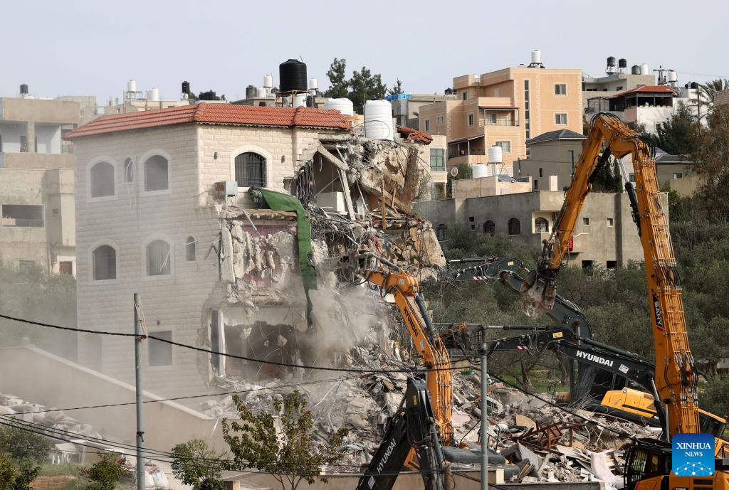 Israeli excavators demolish a Palestinian house in the village of Shuqba, west of Ramallah in the central West Bank, on Jan. 21, 2026. On Wednesday, Israeli forces demolished three Palestinian homes in the village of Shuqba, citing the lack of building permits, Palestinian sources said. (Photo by Nidal Eshtayeh/Xinhua)