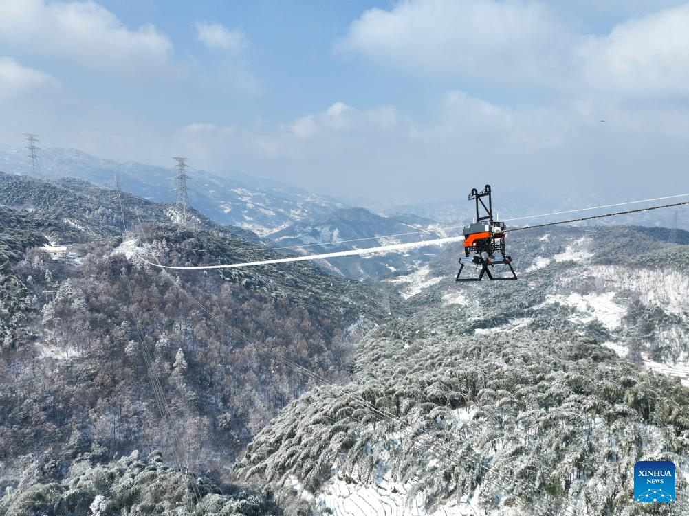An aerial drone photo taken on Jan. 21, 2026 shows a deicing device operation on a power transmission line in Jinzhai County, east China's Anhui Province. (Photo by Zhao Xianfu/Xinhua)