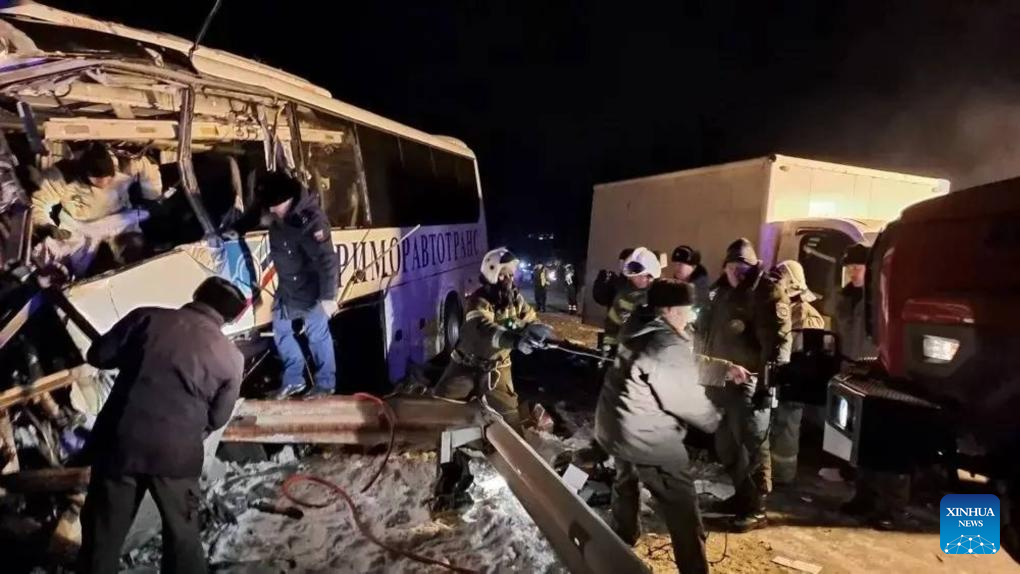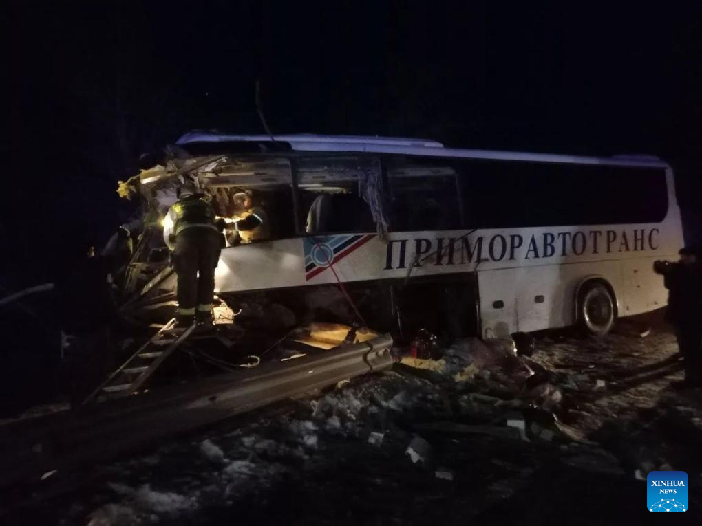 The site of a bus accident is seen in Russia's Primorsky Krai on Jan. 22, 2026. At least three people were killed and eight others injured on Thursday when a bus collided with a truck in Russia's Primorsky Krai, media reported. According to Vladivostok News, the accident occurred on a highway in the Khasan district of Primorsky Krai. The truck lost control and veered into the oncoming lane, causing the collision. Of the 14 people on board the bus, the driver and two passengers were killed. (Government of Khasan district of Primorsky Krai/Handout via Xinhua)
