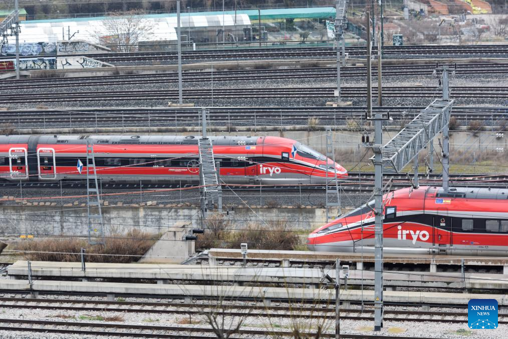 This photo taken on Jan. 21, 2026 shows two bullet trains passing each other near Atocha Station in Madrid, Spain. Adif, Spain's state-owned railway infrastructure manager, announced on Tuesday that it has imposed temporary speed limits on certain sections of the high-speed railway from Madrid to Barcelona, after train drivers reported bumps along the rail link. (Photo by Gustavo Valiente/Xinhua)