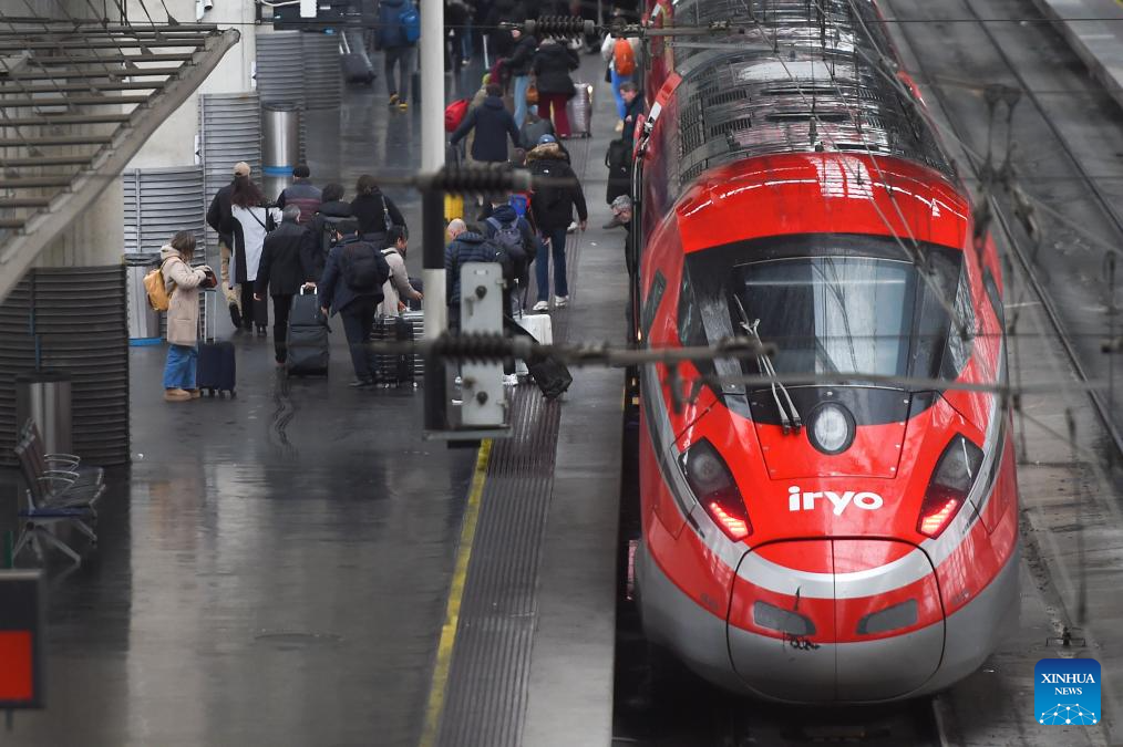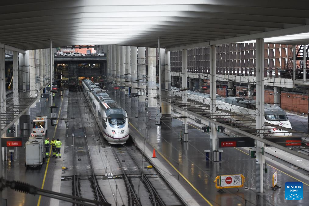 A bullet train is pictured at Atocha Station in Madrid, Spain, Jan. 21, 2026. Adif, Spain's state-owned railway infrastructure manager, announced on Tuesday that it has imposed temporary speed limits on certain sections of the high-speed railway from Madrid to Barcelona, after train drivers reported bumps along the rail link. (Photo by Gustavo Valiente/Xinhua)