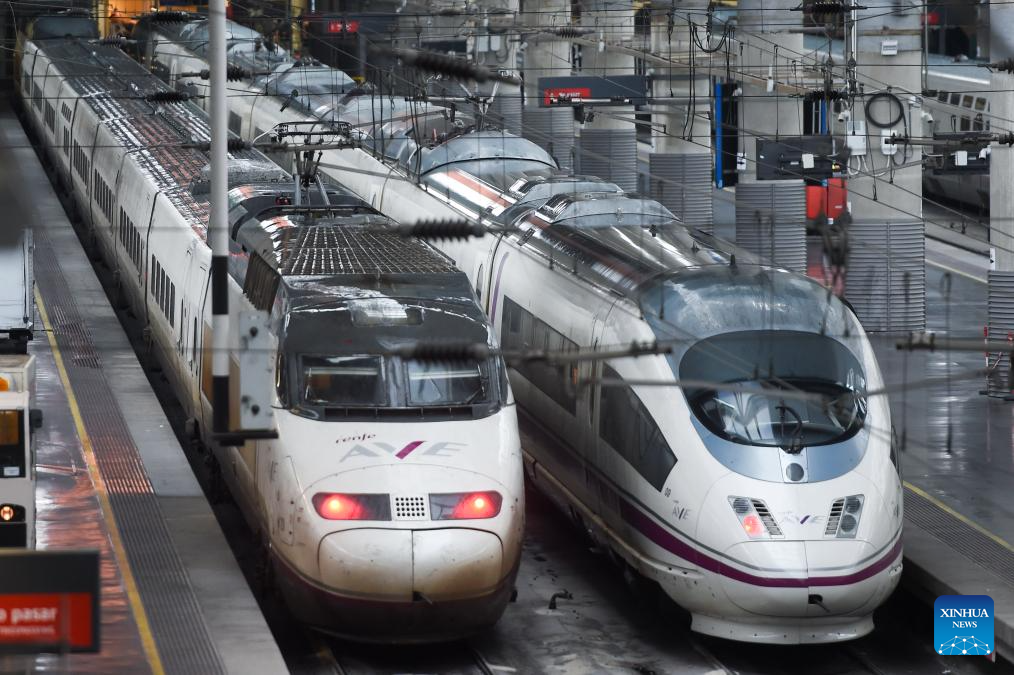 This photo taken on Jan. 21, 2026 shows high-speed trains at Atocha Station in Madrid, Spain. Adif, Spain's state-owned railway infrastructure manager, announced on Tuesday that it has imposed temporary speed limits on certain sections of the high-speed railway from Madrid to Barcelona, after train drivers reported bumps along the rail link. (Photo by Gustavo Valiente/Xinhua)