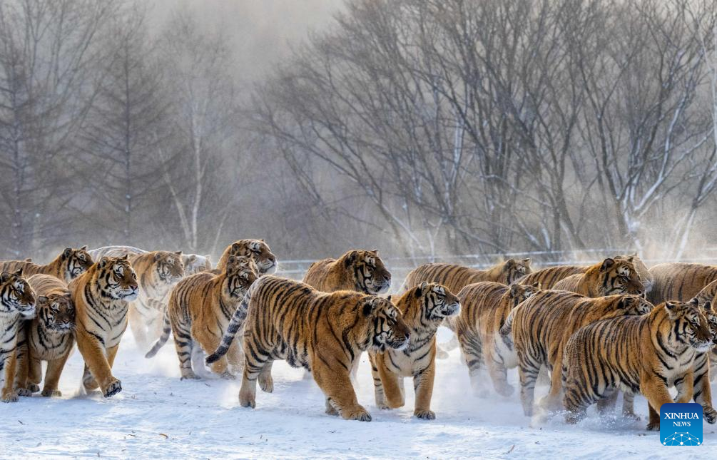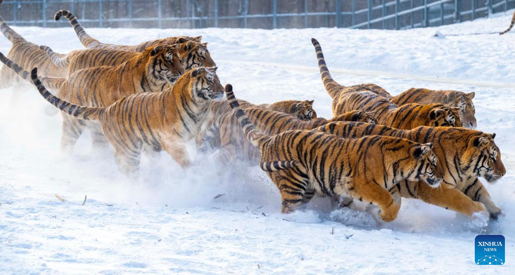 Siberian tigers vie for food in the snow at the Siberian Tiger Park in Hailin, northeast China's Heilongjiang Province, on Jan. 21, 2026. (Photo by He Huawen/Xinhua)