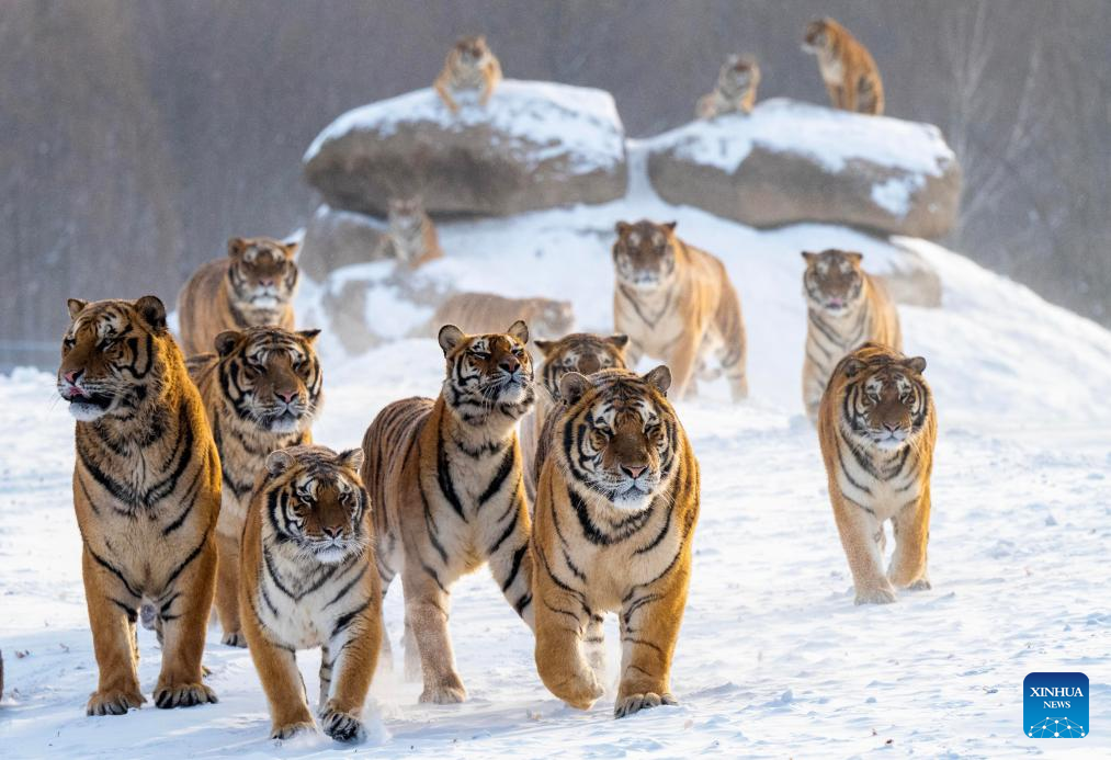 Siberian tigers are pictured in the snow at the Siberian Tiger Park in Hailin, northeast China's Heilongjiang Province, on Jan. 21, 2026. (Photo by He Huawen/Xinhua)