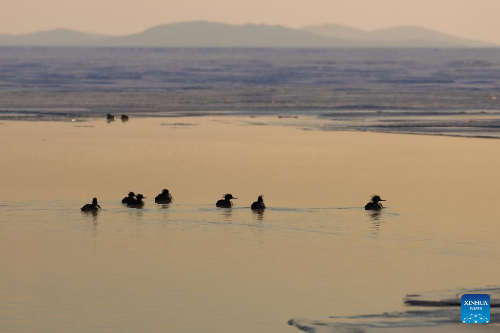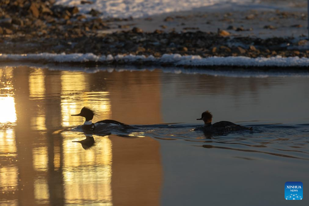 This photo taken on Jan. 23, 2026 shows mergansers in the waters of Vladivostok, Russia. Some birds spend the winter in the unfrozen waters of Vladivostok. (Photo by Andrey Matveenko/Xinhua)
