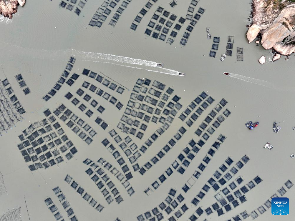 An aerial drone photo shows boats sailing at a mariculture area in Xiahu Town of Xiapu County, Ningde, southeast China's Fujian Province, Jan. 23, 2026. In recent years, Ningde has promoted the high-quality development of the mariculture industry by strengthening marine management and improving the technological application, thus injecting new impetus into rural revitalization. (Xinhua/Jiang Kehong)