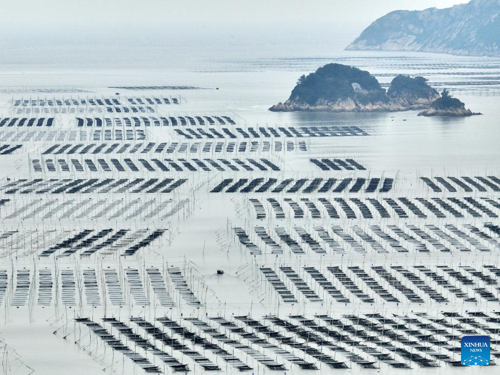 An aerial drone photo shows a laver culture zone in Shacheng Town of Fuding, Ningde, southeast China's Fujian Province, Jan. 22, 2026. In recent years, Ningde has promoted the high-quality development of the mariculture industry by strengthening marine management and improving the technological application, thus injecting new impetus into rural revitalization. (Xinhua/Jiang Kehong)