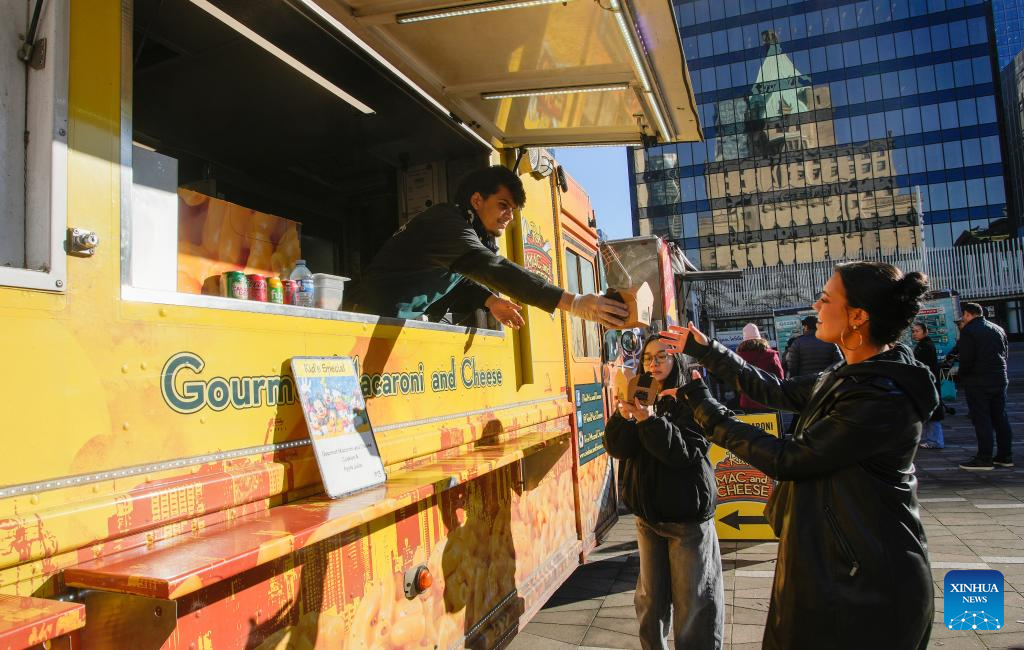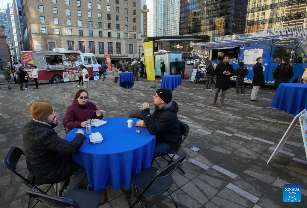 People enjoy their food ordered from food trucks during the "Street Food City" event in Vancouver, British Columbia, Canada, Jan. 23, 2026. (Photo by Liang Sen/Xinhua)