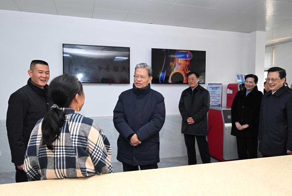 Zhao Leji, a member of the Standing Committee of the Political Bureau of the Communist Party of China Central Committee and chairman of the National People's Congress Standing Committee, inspects a local legislators' liaison station in Wuchang District of Wuhan City, central China's Hubei Province, Jan. 24, 2026. Zhao made a research tour in central China's Hubei Province from Thursday to Saturday. (Xinhua/Rao Aimin)