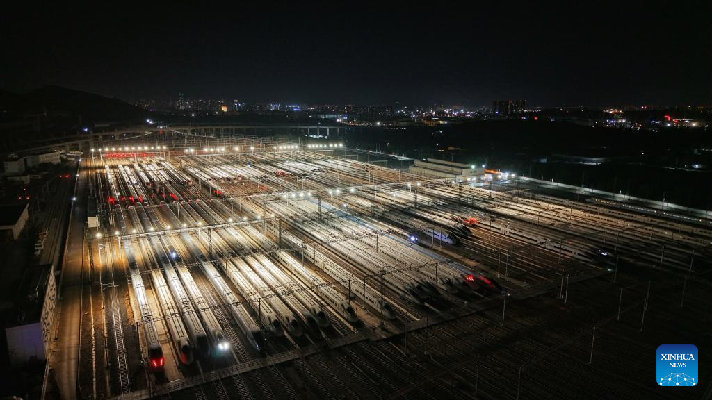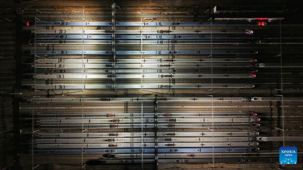 An aerial drone photo taken on Jan. 25, 2026 shows the bullet trains at a depot in Kunming, southwest China's Yunnan Province. A new train schedule will be put into effect in China from Jan. 26. 2026. (Photo by Yang Zixuan/Xinhua)