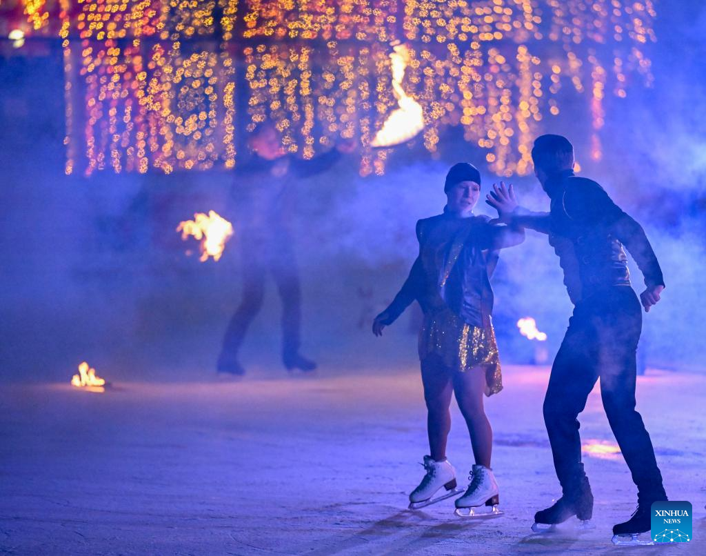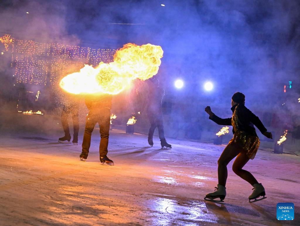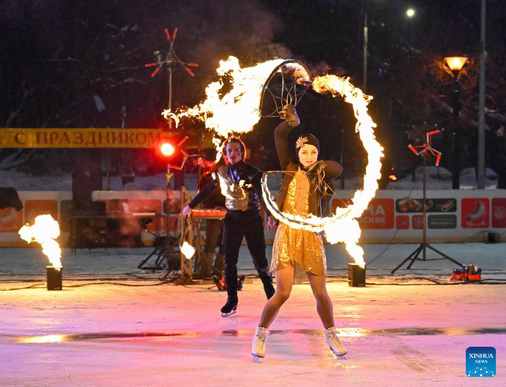 Artists perform during a show named "flaming ice" at an ice rink in a park in Moscow, Russia, Jan. 24, 2026. (Xinhua/Hao Jianwei)