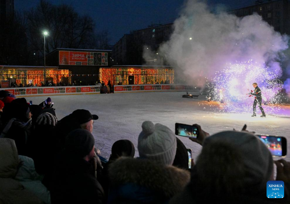 People watch a show named "flaming ice" at an ice rink in a park in Moscow, Russia, Jan. 24, 2026. (Xinhua/Hao Jianwei)