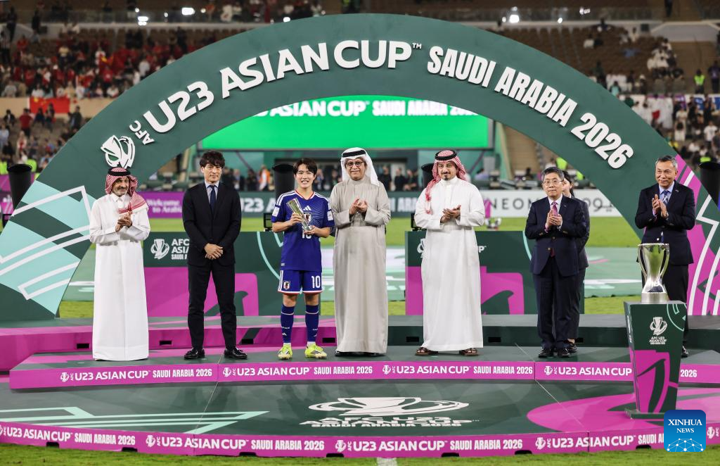 Sato Ryunosuke (3rd L) of Japan receives MVP honor during the awarding ceremony after the 2026 AFC U23 Asian Cup final match between China and Japan in Jeddah, Saudi Arabia, Jan. 24, 2026. (Xinhua/Wang Haizhou)