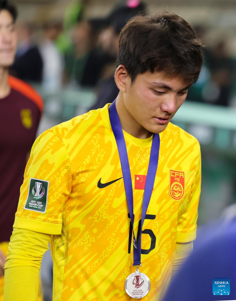 Li Hao, goalkeeper of China reacts during the awarding ceremony after the 2026 AFC U23 Asian Cup final match between China and Japan in Jeddah, Saudi Arabia, Jan. 24, 2026. (Xinhua/Wang Haizhou)