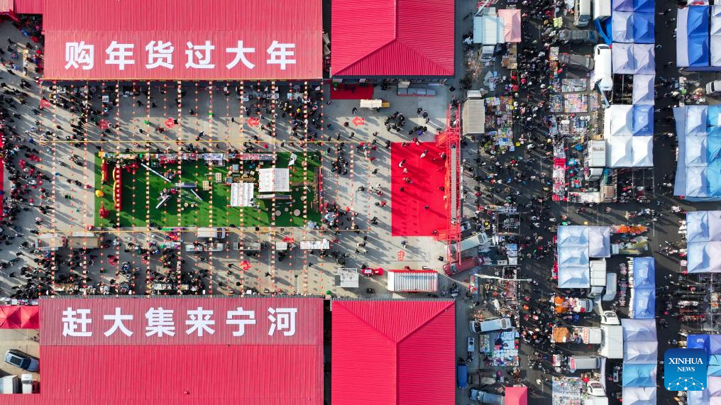 A drone photo taken on Jan. 26, 2026 shows an open air market during the Laba Festival in Tianjin, north China. This year's Laba Festival falls on Monday, coinciding with the opening of the Lutai Market in Tianjin. The market features traditional activities such as free distribution of Laba porridge, calligraphy of the character "Fu" for blessings, and a village chef competition, attracting numerous residents from surrounding areas. (Xinhua/Sun Fanyue)