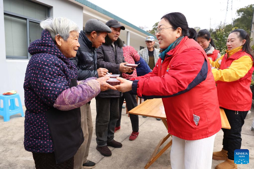 Volunteers serve Laba porridge to elderly residents in Dinghai District of Zhoushan, east China's Zhejiang Province, on Jan. 25, 2026. Various activities were held across the country to celebrate the Laba Festival that falls on Jan. 26 this year. (Photo by Chen Yongjian/Xinhua)