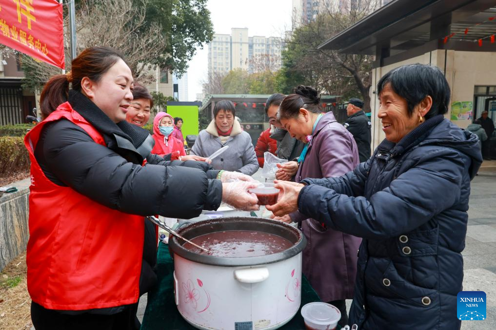 Volunteers serve Laba porridge to the residents in Taixing City, east China's Jiangsu Province, on Jan. 25, 2026. Various activities were held across the country to celebrate the Laba Festival that falls on Jan. 26 this year. (Photo by Gu Jihong/Xinhua)