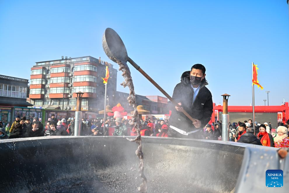 A staff member makes Laba porridge at an open air market during the Laba Festival in Tianjin, north China, Jan. 26, 2026. This year's Laba Festival falls on Monday, coinciding with the opening of the Lutai Market in Tianjin. The market features traditional activities such as free distribution of Laba porridge, calligraphy of the character "Fu" for blessings, and a village chef competition, attracting numerous residents from surrounding areas. (Xinhua/Sun Fanyue)